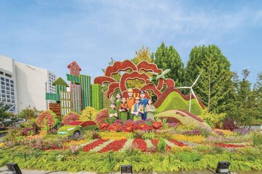 今年,东起建国门,西至复兴门,北京城建园林团队在长安街沿线组立体花坛,用植物勾勒出中国式现代化的鲜活图景,从“和平发展”到“美好明天”,生动展现了祖国繁荣昌盛、人民安居乐业的美好景象。东部的“光辉历程”“黄河赞歌”等5组花坛展现红色传承;西边的“乡村振兴”“绿色生活”等5组花坛则侧重民生图景。